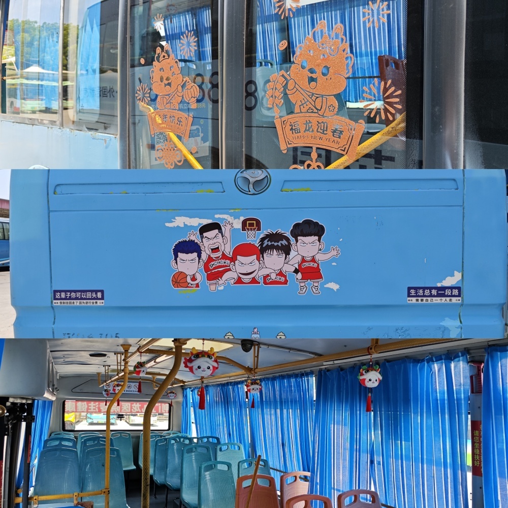 2020#車還有另外幾處細(xì)節(jié),引起小編注意,上下車門(mén)處貼有卡通人物和“福龍迎春”貼紙,車尾部貼有“灌籃高手”人物貼紙和提示標(biāo)語(yǔ),車廂內(nèi)的扶手桿則掛滿了喜慶娃娃??吹竭@些裝飾和布置,仿佛感受到了駕駛員的熱情、認(rèn)真和細(xì)膩。