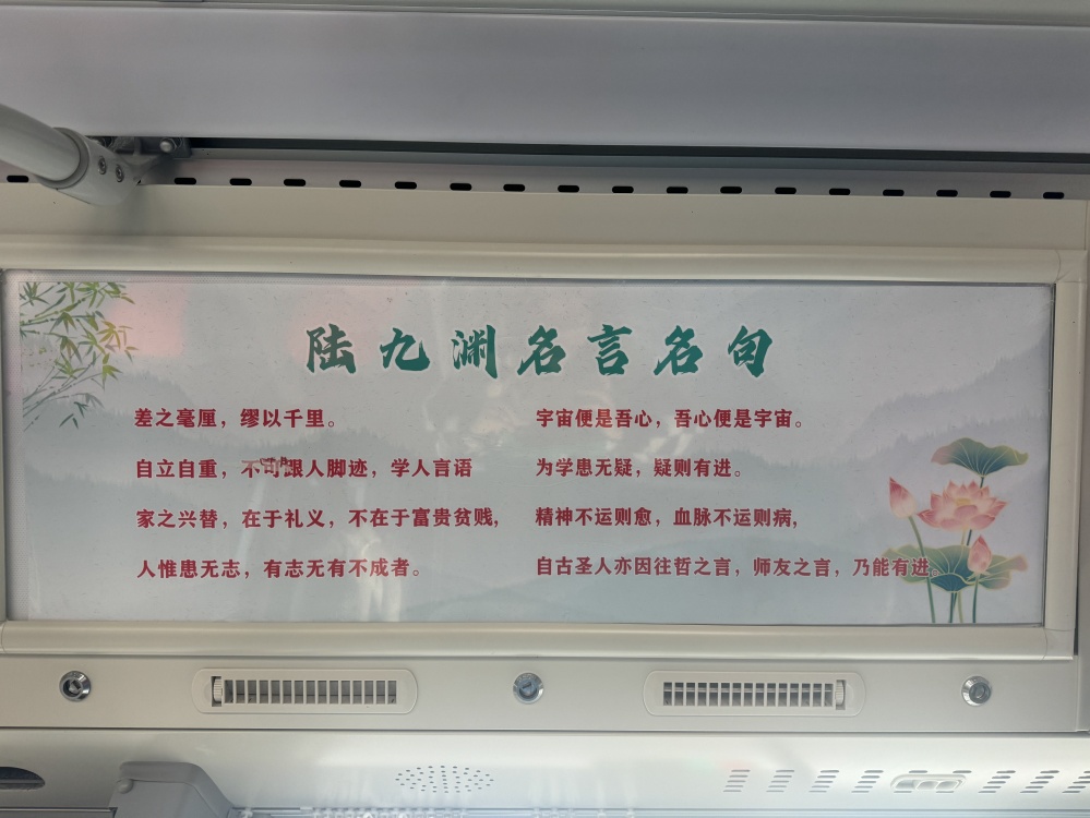 “陸九淵號”不僅僅是一條公交線路,更是一個移動文化陣地。當你踏上這趟公交車,你會被駕駛員的熱情服務(wù)所感染,他們微笑著迎接每一位乘客,以優(yōu)質(zhì)的服務(wù)彰顯著荊門的文化精神和城市溫度。車輛全部采用新能源公交車,不僅環(huán)保節(jié)能,行駛起來也更為平穩(wěn),同時,在車輛內(nèi)外裝飾以及“進站、出站、溫馨提示”等場景語音播報融入陸九淵相關(guān)元素,讓乘客潛移默化的加深對荊門文化的認識和理解。