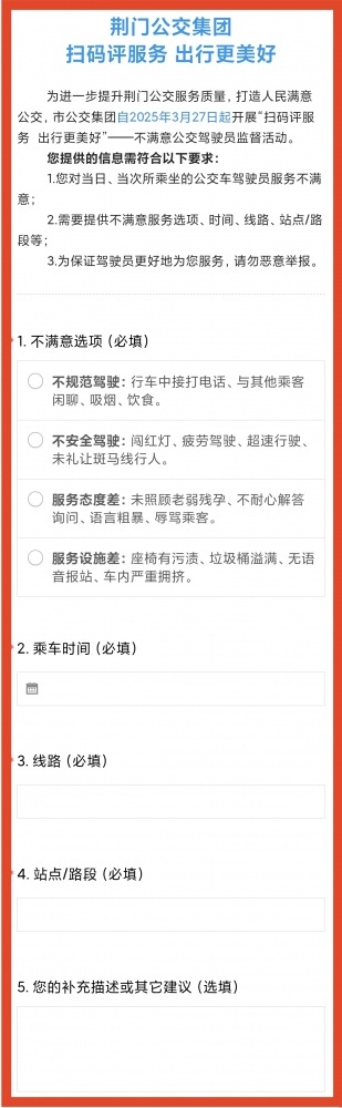 市民乘客可通過掃描公交車上的“服務(wù)監(jiān)督二維碼”,進(jìn)入“不滿意公交駕駛員監(jiān)督舉報”頁面,填寫詳細(xì)舉報信息(評價頁面如下)。