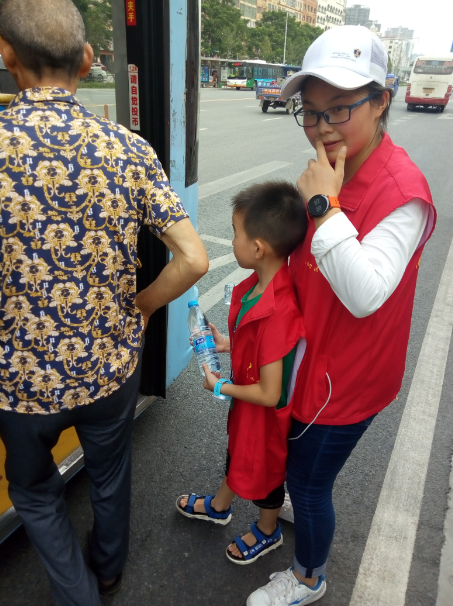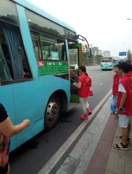15時許,志愿者們已經(jīng)布置好了送水點,將箱礦泉水擺在了站臺旁邊。每有一輛公交車進站???,志愿者們都會給駕駛員們遞上兩瓶礦泉水,還有一些放暑假的小朋友們,也熱情的加入到此次活動,充當著志愿主力軍,用他們的行動清涼了公交駕駛員的心,傳播著社會正能量。