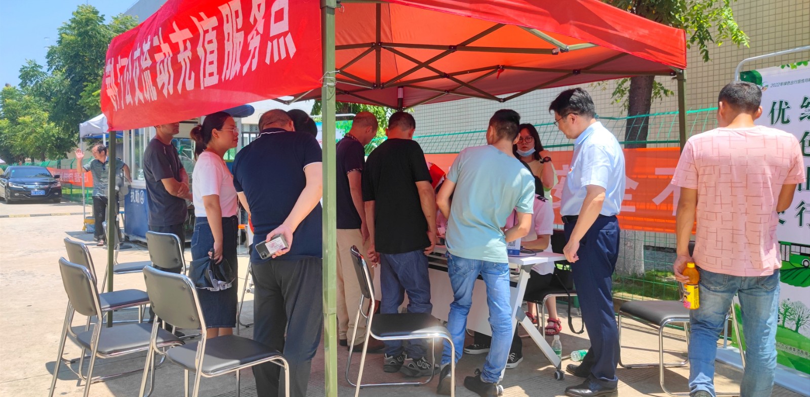 當(dāng)天中午12時,正是一天最炎熱的時候,也是廠區(qū)職工午休時間。選在這個時間段開展流動服務(wù),是可以最大程度方便殘疾工友,不會耽擱到他們的生產(chǎn)作業(yè),更不會影響他們正常休息,服務(wù)點就設(shè)在他們下班的必經(jīng)路。